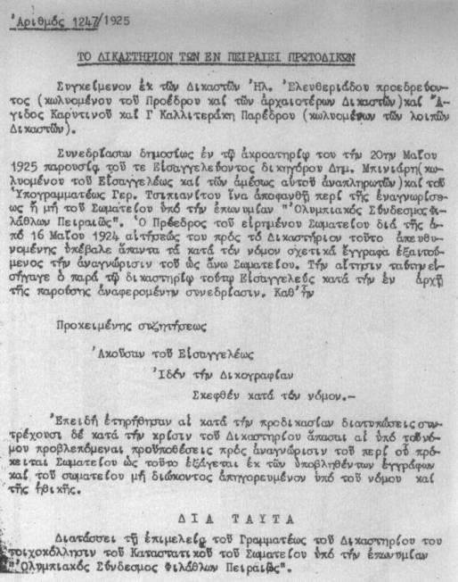 Επίσημα ο Ολυμπιακός ιδρύθηκε στις 20 Μαΐου του 1925 με την υπ’ αριθμ. 1247 / 1925 απόφαση του Δικαστηρίου των εν Πειραιεί Πρωτοδικών, το οποίο «διατάσσει τη επιμέλεια του Γραμματέων του Δικαστηρίου την τοιχοκόλλησιν του Καταστατικού του Σωματείου υπό την επωνυμίαν «Ολυμπιακός Σύνδεσμος Φιλάθλων Πειραιώς».