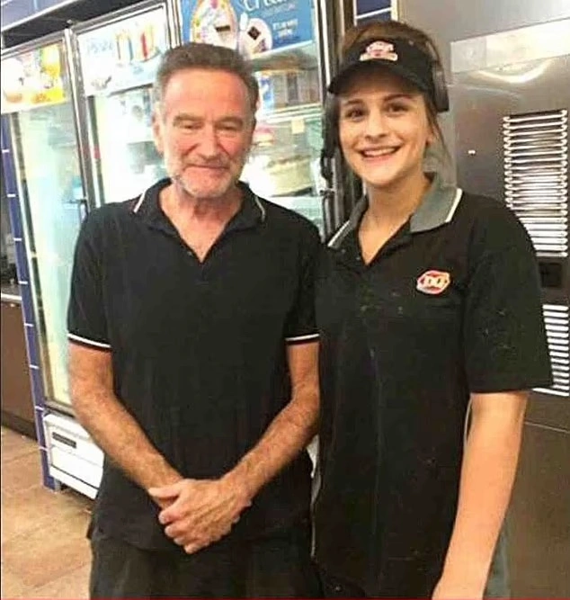 Εμφανιζόμενος κάπως σκυθρωπός και αδύναμος, ο αγαπημένος ηθοποιός Robin Williams φαίνεται να ποζάρει με τη σερβιτόρα… Abby Albers σε ένα παγωτατζίδικο Dairy Queen στο Lindstrom της Μινεσότα, στις 29 Ιουνίου 2014.
