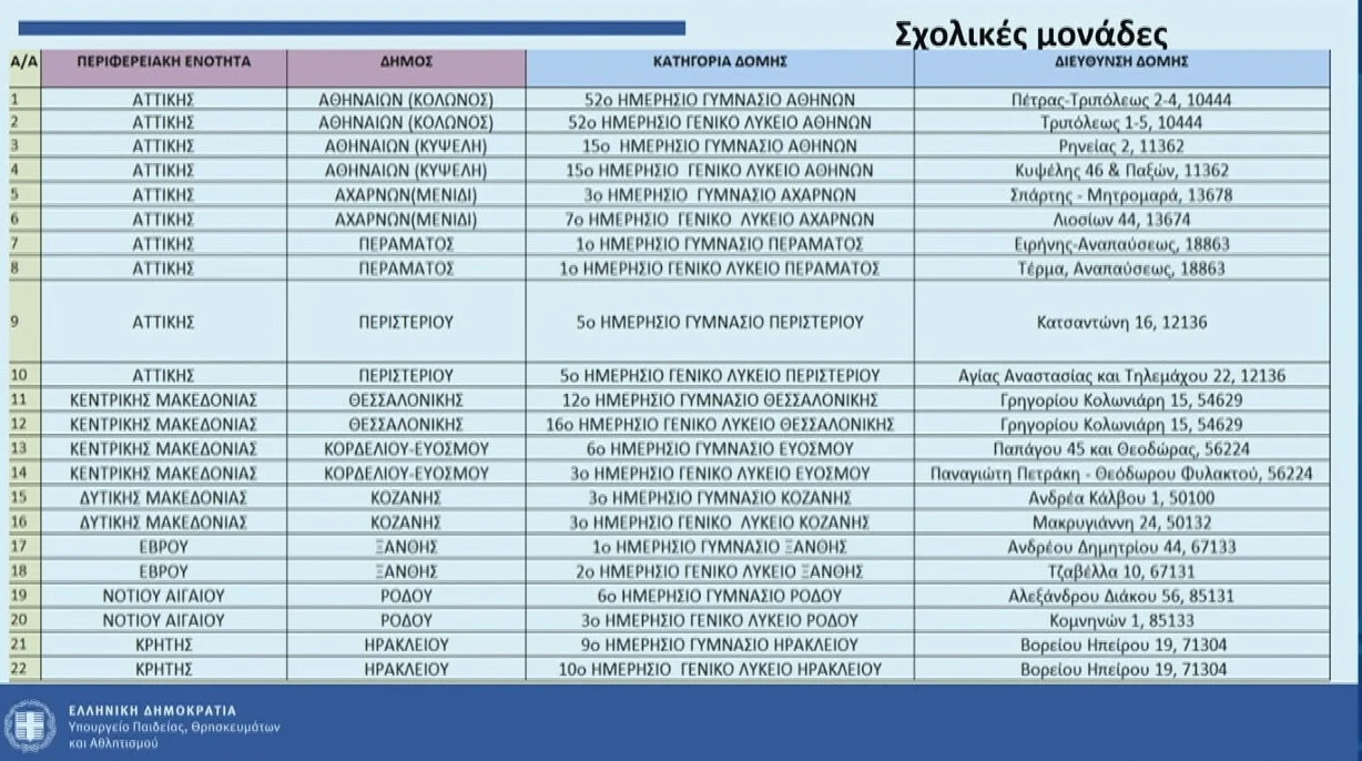 Τα 6 πρώτα σχολεία να ξεκινήσουν το 2025-26 και θα είναι κατανεμημένα σε περιοχές όπως ο Κολωνός, η Κυψέλη, το Μενίδι, το Πέραμα, το Περιστέρι. Το Κορδελιό, η Κοζάνη, η Ξάνθη, η Ρόδος και το Ηράκλειο Κρήτης. Με στόχο την πρωτοβουλία να επεκταθεί και να καλύψει περισσότερες περιοχές.