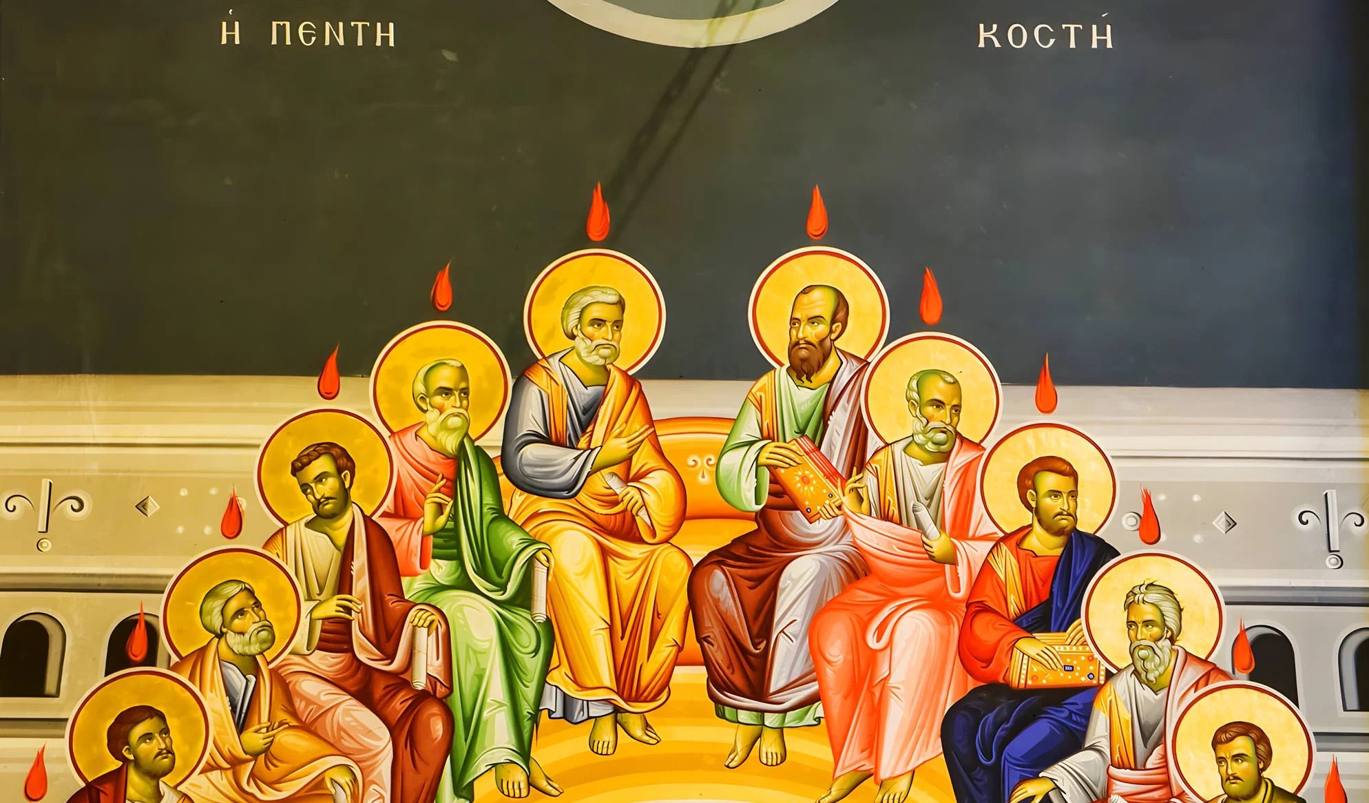 Όταν συμπληρώθηκε η ημέρα της Πεντηκοστής, οι μαθητές ήταν συγκεντρωμένοι. Ξαφνικά, ακούστηκε ένας δυνατός ήχος από τον ουρανό. Σαν βίαιος άνεμος, και εμφανίστηκαν γλώσσες σαν φωτιά, που κάθισαν πάνω σε καθέναν. Όλοι πληρώθηκαν με Άγιο Πνεύμα και άρχισαν να μιλούν σε διαφορετικές γλώσσες.