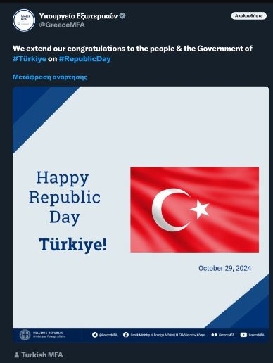 Αδιανόητες ευχές Γεραπετρίτη για την Ημέρα της Τουρκιίας… Μια ενέργεια του Υπουργείου Εξωτερικών της Ελλάδας προκάλεσε σοκ και έντονες αντιδράσεις, καθώς δημοσιεύτηκε ένα μήνυμα στον επίσημο λογαριασμό του ΥΠΕΞ, το οποίο περιέχει «ευχές» προς την Τουρκία για την «Ημέρα της Τουρκικής Δημοκρατίας». Η κίνηση αυτή θεωρείται από πολλούς ότι υπονομεύει την ιστορική μνήμη και τις θυσίες των Ελλήνων που υπέστησαν φρικτές διώξεις, σφαγές και γενοκτονίες.