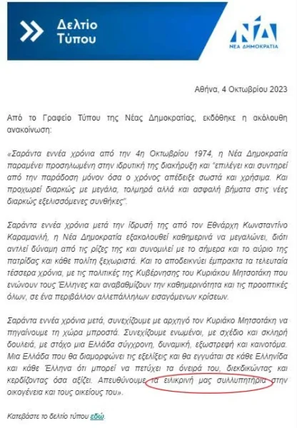 «Σαράντα εννέα χρόνια μετά την ίδρυσή της από τον Εθνάρχη Κωνσταντίνο Καραμανλή, η Νέα Δημοκρατία εξακολουθεί καθημερινά να μεγαλώνει» αναφέρει το ΔΤ για να συνεχίσει με αναφορά στον Κυριάκο Μητσοτάκη που όπως αναφέρει πηγαίνει τη χώρα μπροστά και εγγυάται «σε κάθε Ελληνίδα και κάθε Έλληνα ότι μπορεί να πετύχει τα όνειρά του, διεκδικώντας και κερδίζοντας όσα αξίζει». Και εκεί ακολουθούν τα… ειλικρινή συλλυπητήρια του κόμματος.
