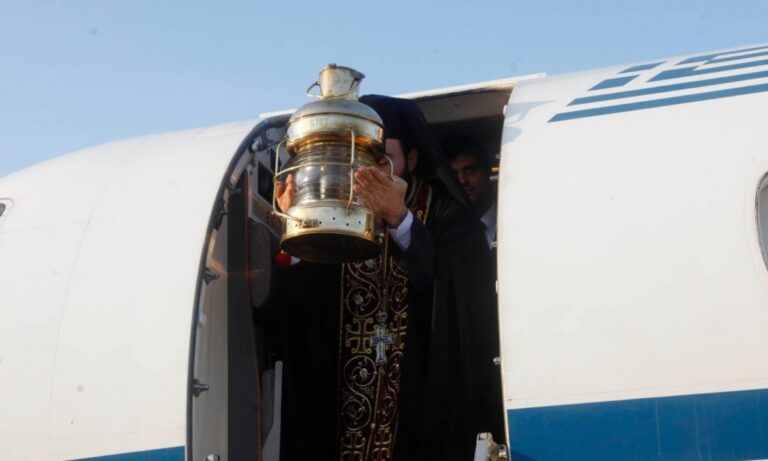 Λίγες ώρες μετά την τελετή αφής του Αγίου Φωτός στα Ιεροσόλυμα, η ιερή φλόγα έφτασε στην Αθήνα με ειδική πτήση του κυβερνητικού αεροσκάφους.