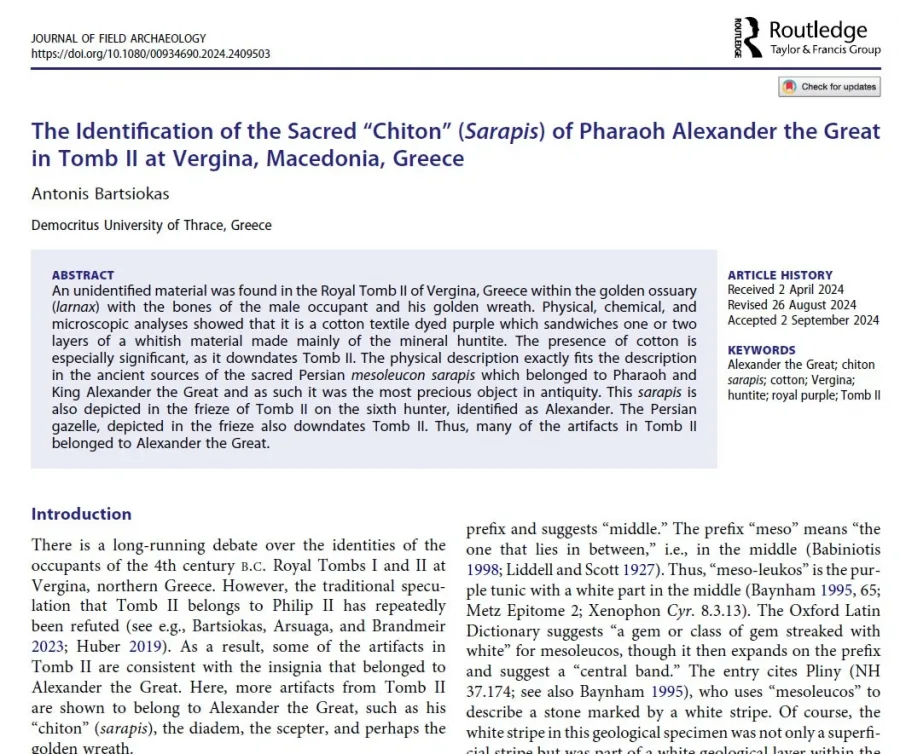 Αυτό είναι το χιτώνιο του Μεγάλου Αλέξανδρου που βρέθηκε στη Βεργίνα… Η ανακάλυψη που περιγράφεται από τον ομότιμο καθηγητή του Δημοκριτείου Πανεπιστημίου Θράκης, Αντώνιο Μπαρτζιώκα, έφερε στο προσκήνιο συζητήσεις γύρω από τον αρχαιολογικό χώρο της Βεργίνας και, πιο συγκεκριμένα, για τον υποτιθέμενο εντοπισμό του χιτώνα του Μεγάλου Αλεξάνδρου. Ο κ. Ο Μπαρτζιώκας δήλωσε στο Newsbomb.gr ότι πρόσφατες έρευνες στην περιοχή αποκαλύπτουν ένα σπουδαίο εύρημα που ενδέχεται να είναι ο χιτώνας του μεγάλου στρατηλάτη, πυροδοτώντας αντιδράσεις από την επιστημονική κοινότητα και τις επίσημες αρχές.