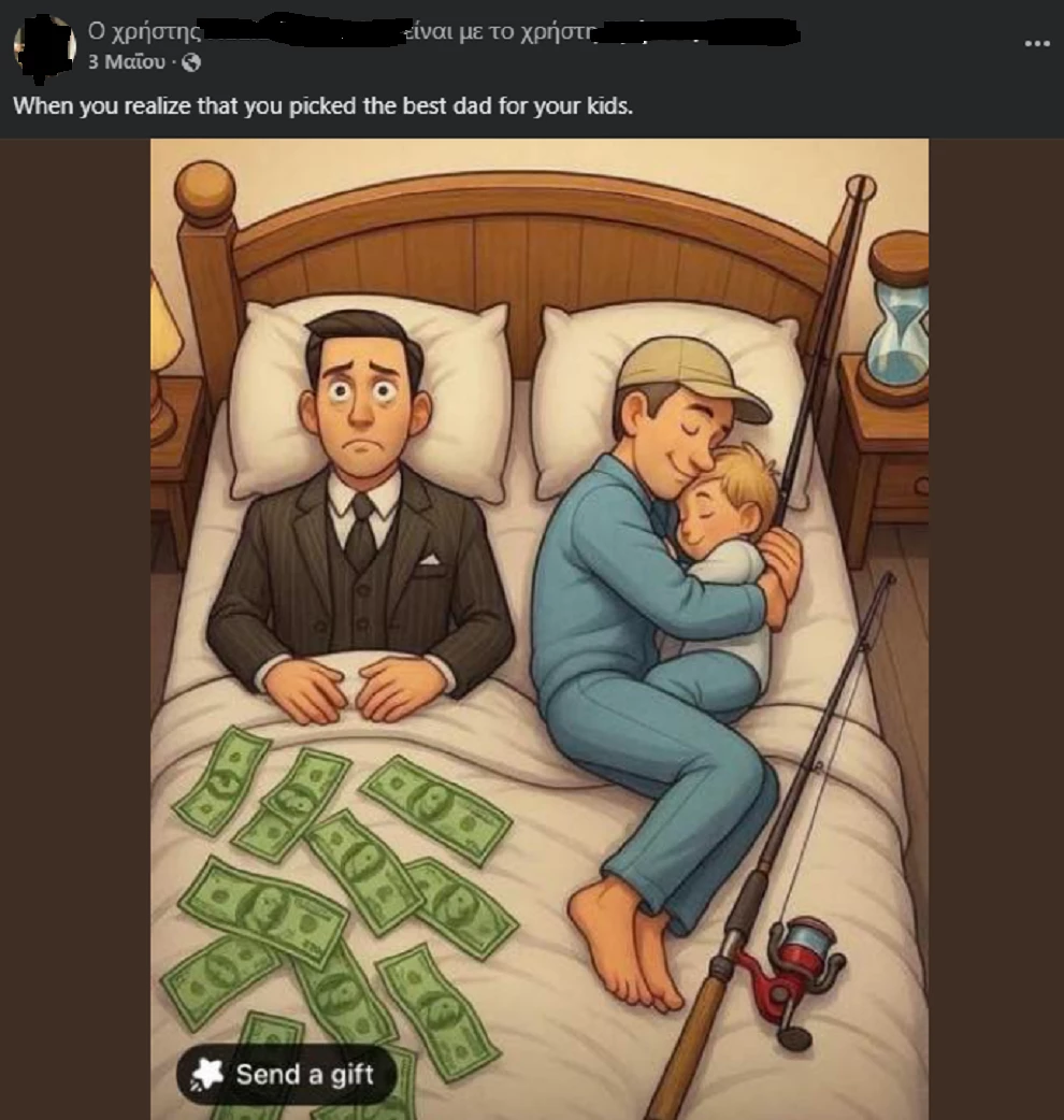 Μόλις μια ημέρα πριν από την δολοφονία, η γυναίκα προέβη σε μια ανατριχιαστική δημοσίευση στο Facebook. Επρόκειτο για μια εικόνα, προϊόν τεχνητής νοημοσύνης, η οποία απεικόνιζε δύο πατεράδες: έναν πλούσιο που αγκαλιάζει χρήματα και έναν φτωχό που κρατά ένα παιδί στην αγκαλιά του. Η λεζάντα που συνόδευε την εικόνα ήταν εξίσου προβληματική: «Όταν συνειδητοποιείς ότι διαλέγεις τον σωστό πατέρα για τα παιδιά σου».