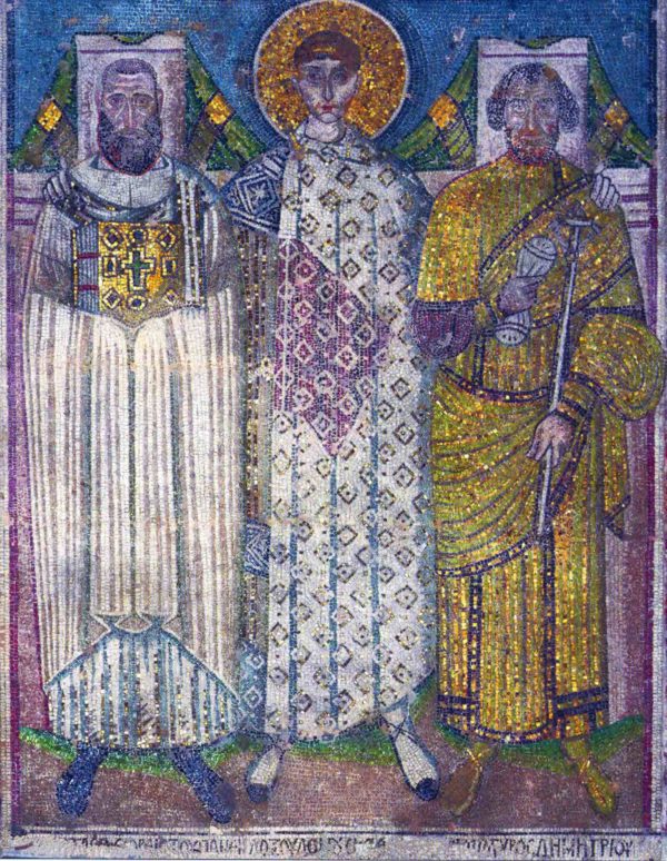 Ο ΑΓΙΟΣ ΔΗΜΗΤΡΙΟΣ ΜΕ ΤΟΥΣ ΚΤΙΤΟΡΕΣ (7ος αιώνας): Στον πεσσό στη νότια – δεξιά πλευρά του ιερού βήματος είναι το ψηφιδωτό με τους κτίτορες, έναν εκκλησιαστικό και έναν πολιτικό άρχοντα. Κάτω υπάρχει η επιγραφή: «Κτίστας θεωρεῖς τοῦ πανενδόξου δόμου ἐκεῖθεν ἔνθεν μάρτυρος Δημητρίου, τοῦ βάρβαρον κλύδωνα βαρβάρων στόλων μετατρέποντος καί πόλιν λυτρούμενου» Τα πρόσωπα των κτιτόρων είναι ο αρχιεπίσκοπος Θεσσαλονίκης Ιωάννης και ο Λέων, στα χρόνια των οποίων ανακαινίσθηκε ο ναός μετά από την καταστροφή του από την πυρκαγιά τον 7ο αιώνα.