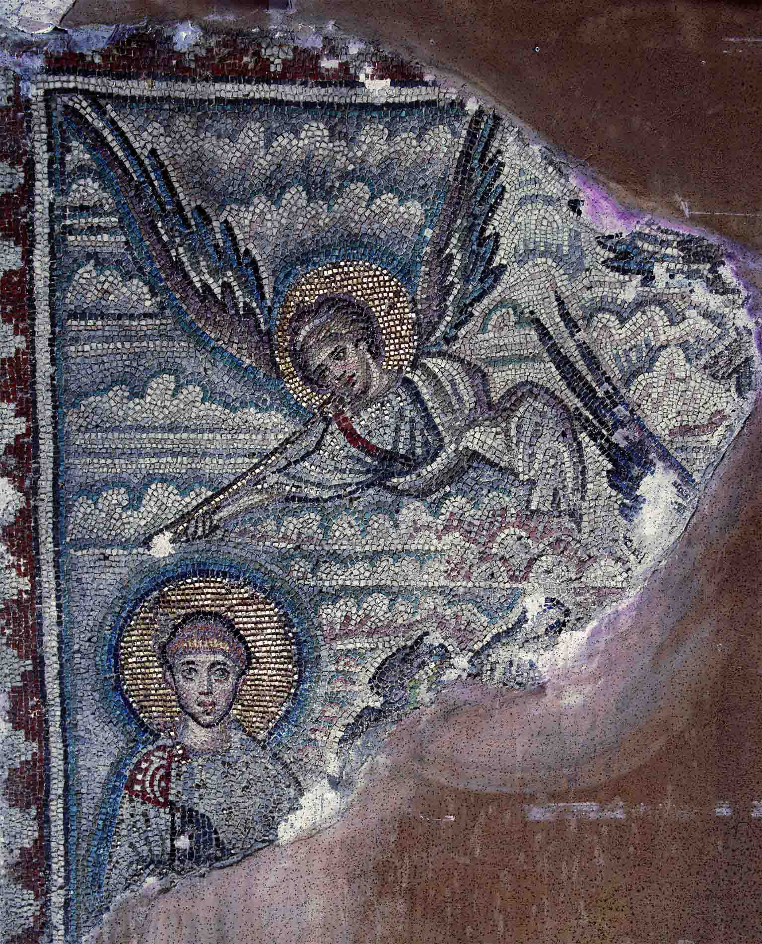 Ο ΑΓΙΟΣ ΔΗΜΗΤΡΙΟΣ ΚΑΙ Ο ΑΓΓΕΛΟΣ (5ος αιώνας): Από την πίσω ακριβώς πλευρά του τοίχου, που βρίσκεται ο τάφος του Λουκά Σπανδούνη, υπάρχει ψηφιδωτό όπου εικονίζεται άγγελος Κυρίου μέσα σε πολύχρωμο ουρανό ο οποίος σαλπίζει βλέποντας τον Άγιο Δημήτριο που στέκει κάτω όρθιος ντυμένος με υπατική χλαμύδα. Πλάι στον Άγιο διακρίνεται ορεινό τοπίο και δεξιότερα και πιο πάνω φτερά άλλων αγγέλων.