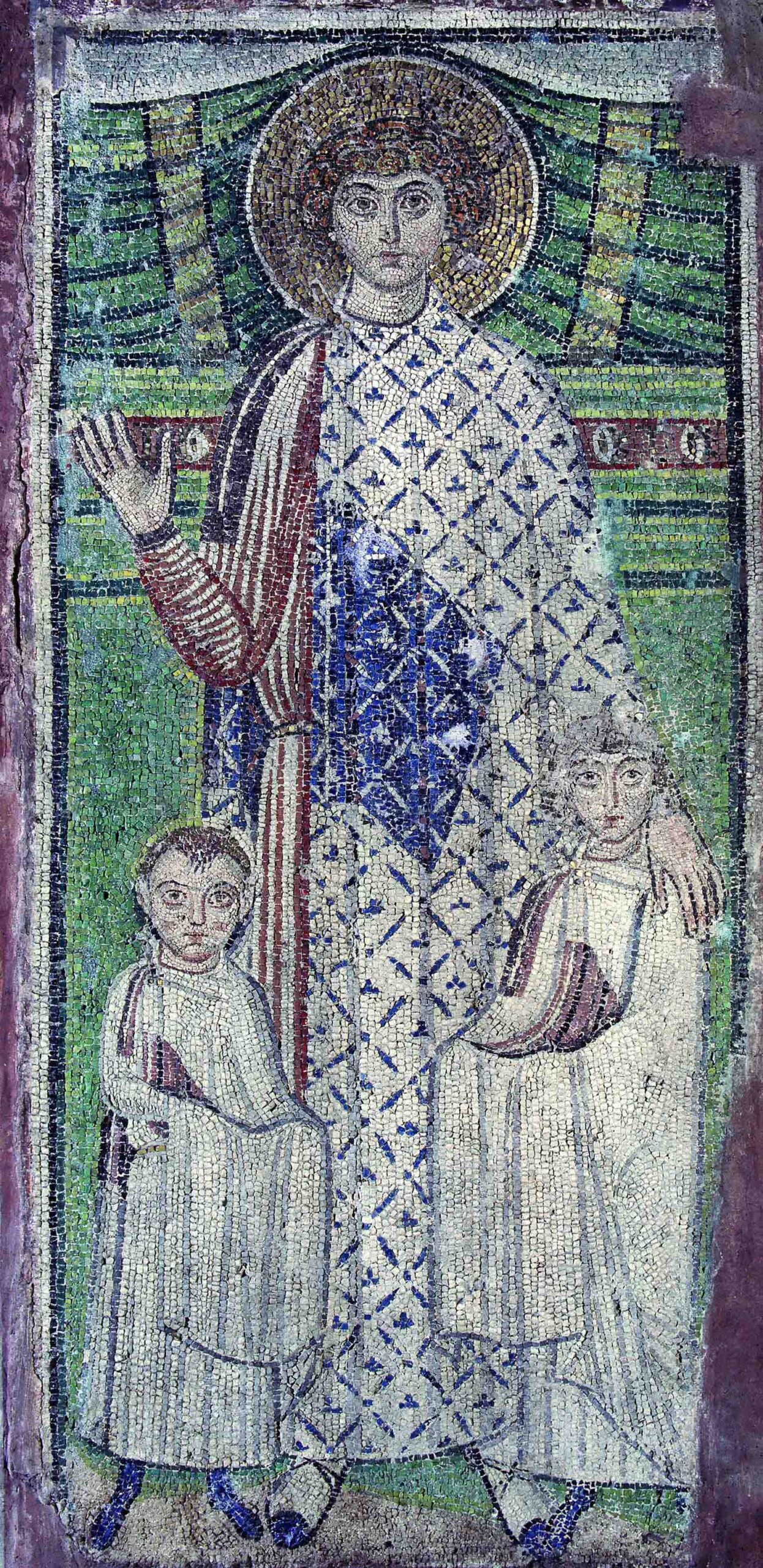 ΤΟ ΨΗΦΙΔΩΤΟ ΤΟΥ ΑΓΙΟΥ ΓΕΩΡΓΙΟΥ ΜΕ ΤΑ ΔΥΟ ΠΑΙΔΙΑ (7ος αιώνας): Πάνω ακριβώς από το πηγάδι του αγιάσματος, στον πεσσό, είναι το ψηφιδωτό που εικονίζει τον Άγιο Γεώργιο με δύο παιδιά. Τα παιδιά, που είναι ντυμένα με χλαμύδα και δείχνουν αρχοντική καταγωγή, απλώνουν σε ικεσία τα χέρια τους που είναι σκεπασμένα με τα ενδύματά τους. Το ψηφιδωτό είναι του 7ου αιώνα.