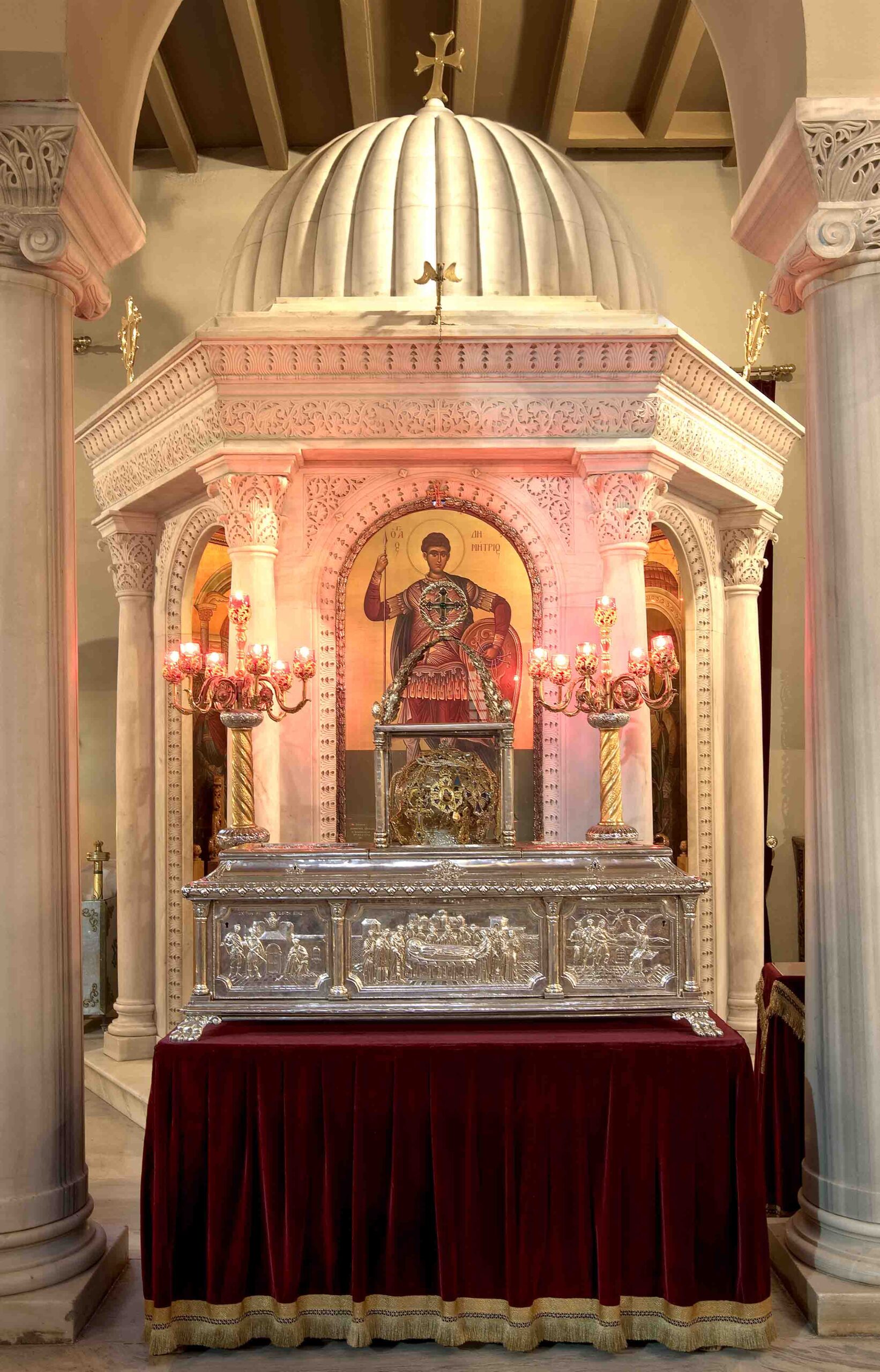 - Η Μεγαλοπρεπής Βασιλική: Ο έπαρχος του Ιλλυρικού, Λεόντιος, αφού θεραπεύτηκε από σοβαρή ασθένεια χάρη στον Άγιο, έκτισε στη θέση του οικίσκου έναν επιβλητικό Ναό τον 5ο αιώνα. Στο μεσαίο κλίτος του μεταφέρθηκε ο τάφος του Αγίου μέσα σε ένα περίτεχνο κιβώριο.