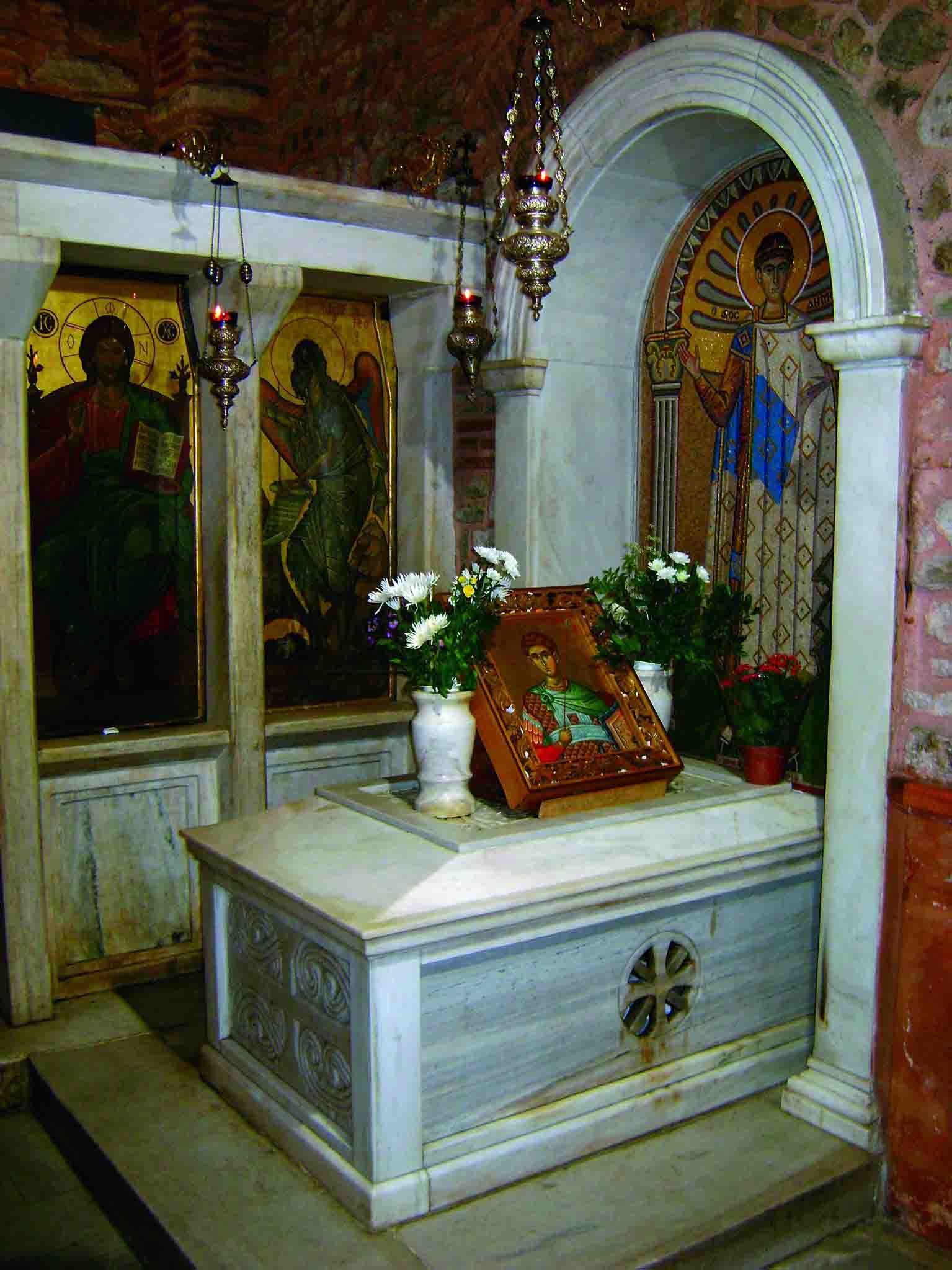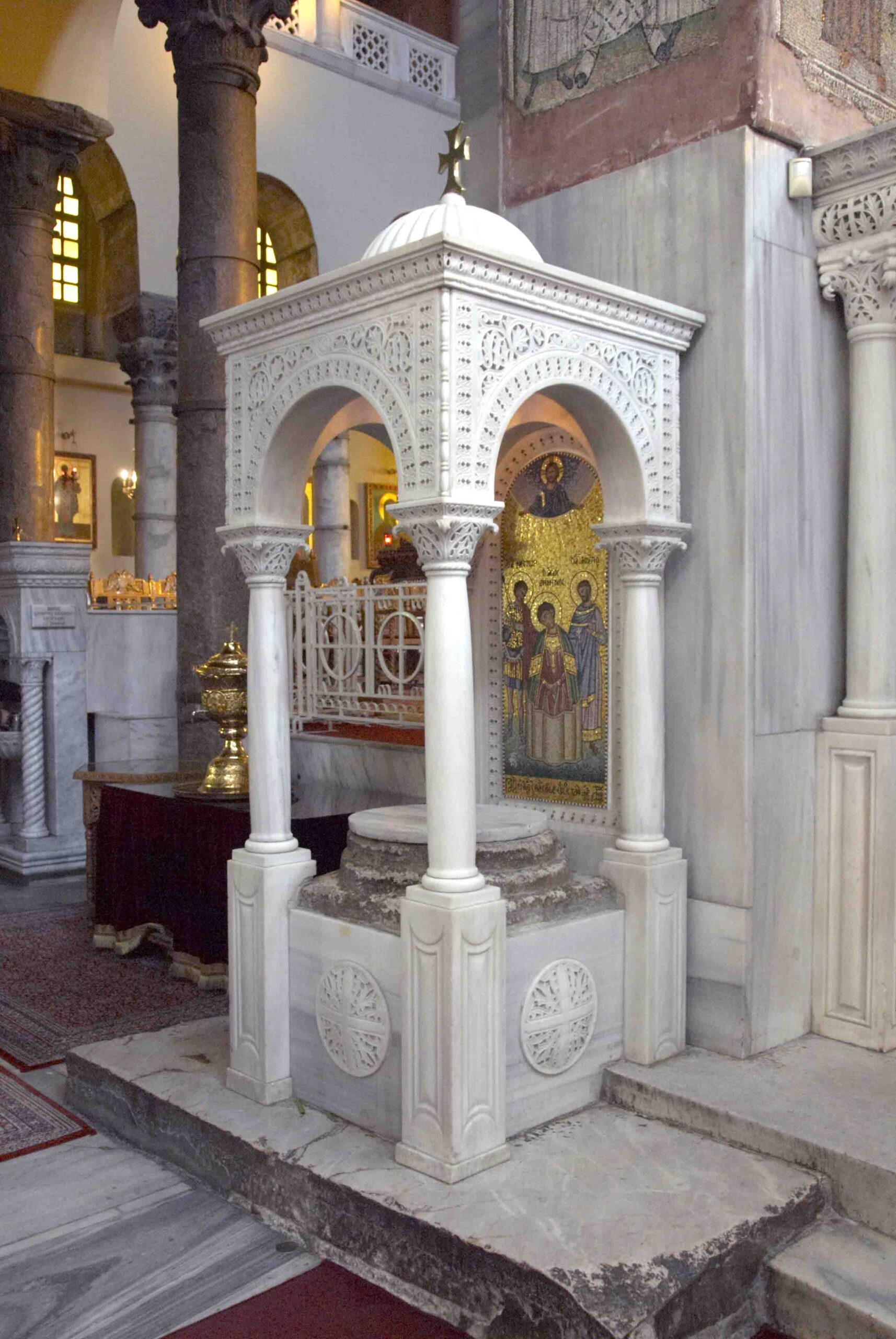 - Ο Πρώτος Οικίσκος: Μετά το Διάταγμα των Μεδιολάνων (313 μ.Χ.), ένας μικρός ναός (οικίσκος) χτίστηκε πάνω από τον τάφο του Αγίου, προσελκύοντας πλήθος πιστών που ζητούσαν θεραπεία.