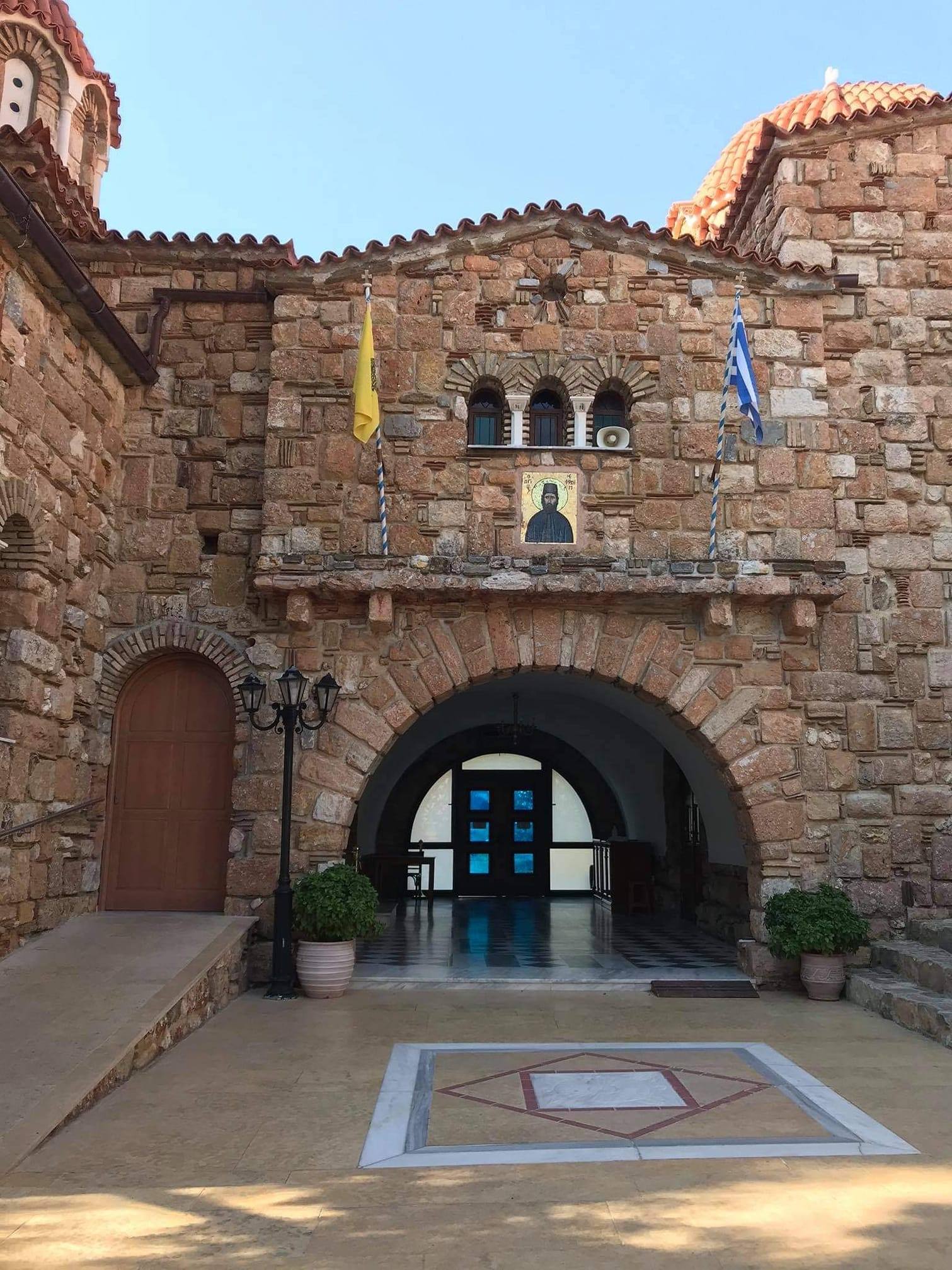 Το καλοκαίρι του 1945, η γερόντισσα επισκέφθηκε τη Νέα Μάκρη Αττικής και ανηφόρισε για να ανάψει το καντηλάκι των ερειπίων της παλαιάς σταυροπηγιακής ανδρώας Ιεράς Κοινοβιακής Μονής του όρους των Αμώμων. Εγκαταστάθηκε στα ερείπια και διαβιούσε με αφάνταστες στερήσεις κάτω από δύσκολες συνθήκες. Για να εξασφαλίσει τα προς το ζην, ξενυχτούσε κάθε βράδυ πλέκοντας κάλτσες, ενώ την ημέρα ξεθάβει τα ερείπια του ναού για να βρει τους θεμέλιους λίθους και να ξαναχτίσει το μοναστήρι και τα κελιά.