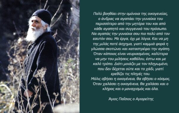 Να αγαπάς την γυναίκα σου πιο πολύ από τον εαυτόν σου. Με έργα, όχι με λόγια. Και να μη της μιλάς ποτέ άσχημα, γιατί καμμιά φορά η γλώσσα σκοτώνει και καταστρέφει την αγάπη. Όταν κάποιος είναι νευριασμένος, καλύτερα να μην του μιλήσεις καθόλου, έστω και με καλό τρόπο. Διότι μοιάζει με τον πληγωμένο, που δεν δέχεται ούτε και το χάδι, γιατί ερεθίζει τις πληγές του.