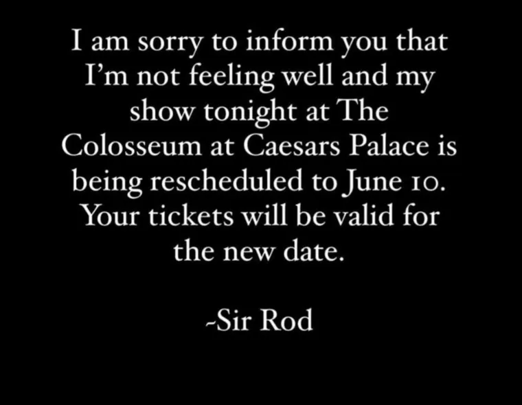 Ο ίδιος ο Σερ Ροντ Στιούαρτ ενημέρωσε τους ακολούθους του μέσω του επίσημου λογαριασμού του στο Instagram. Σε προσωπικό τόνο, ο τραγουδιστής δήλωσε: «Λυπάμαι που σας ενημερώνω ότι δεν αισθάνομαι καλά και η αποψινή μου συναυλία στο The Colosseum at Caesars Palace αναβάλλεται για τις 10 Ιουνίου». Η ανάρτηση αυτή επιβεβαίωσε την αναβολή, με τον ίδιο να αποδίδει την ακύρωση σε λόγους υγείας.