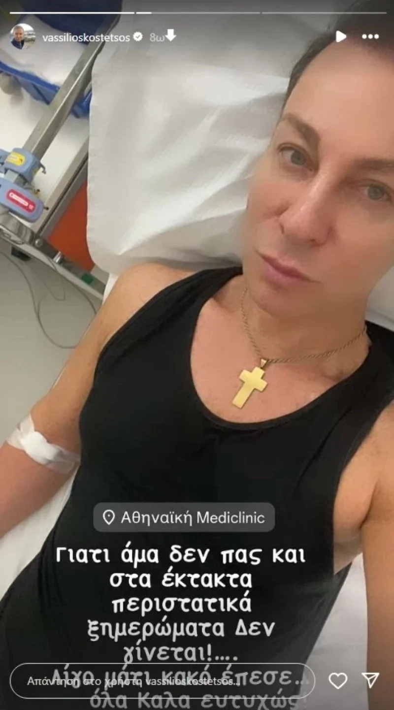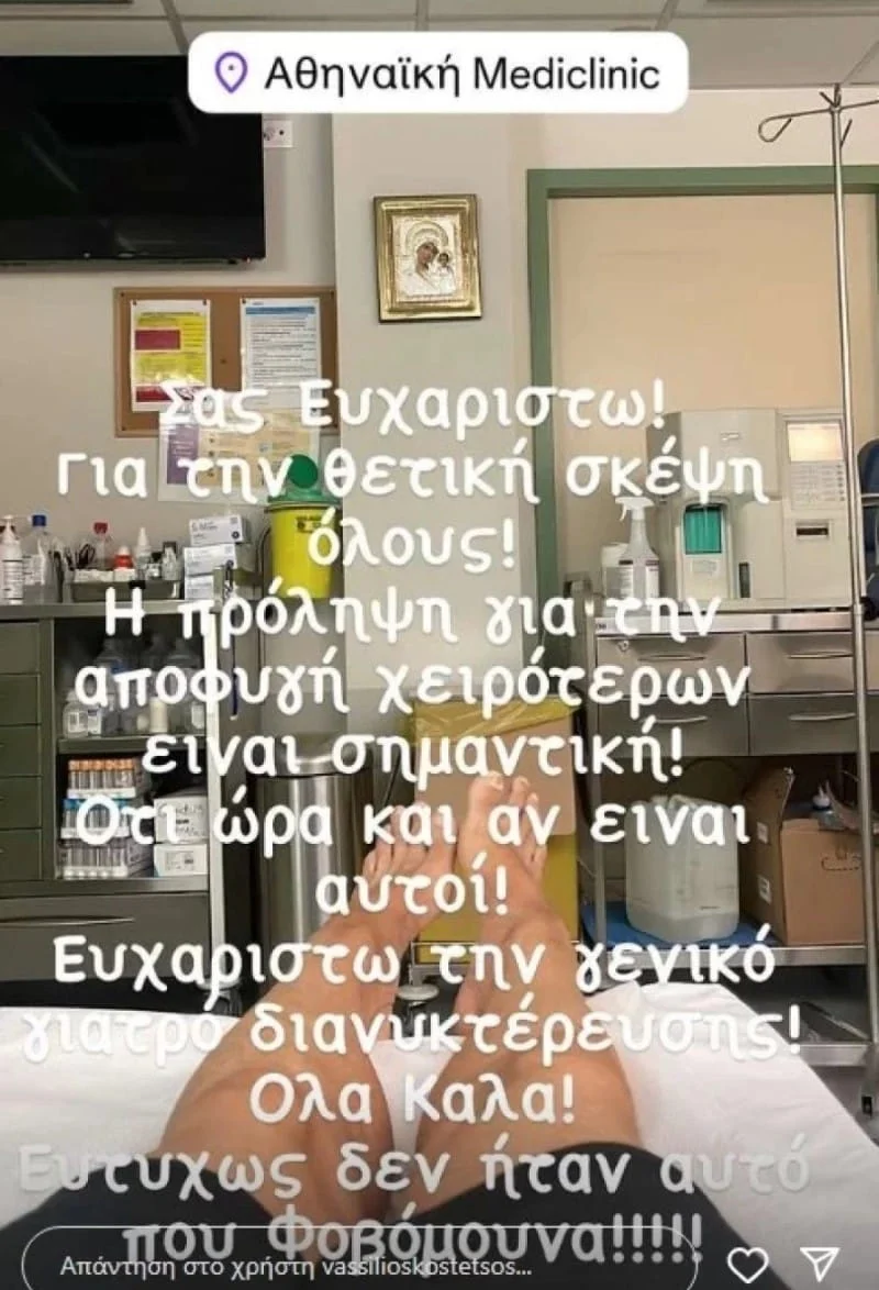 «Γιατί άμα δεν πας και στα έκτακτα περιστατικά ξημερώματα, δεν γίνεται. Λίγο κακό μάτι έπεσε, όλα καλά ευτυχώς», έγραψε χαρακτηριστικά στην πρώτη του ανάρτηση ενώ στην δεύτερη που ακολούθησε δήλωσε «Σας ευχαριστώ για τη θετική σκέψη όλους. Η πρόληψη για την αποφυγή χειρότερων είναι σημαντική. Ό,τι ώρα κι αν είναι αυτή»
