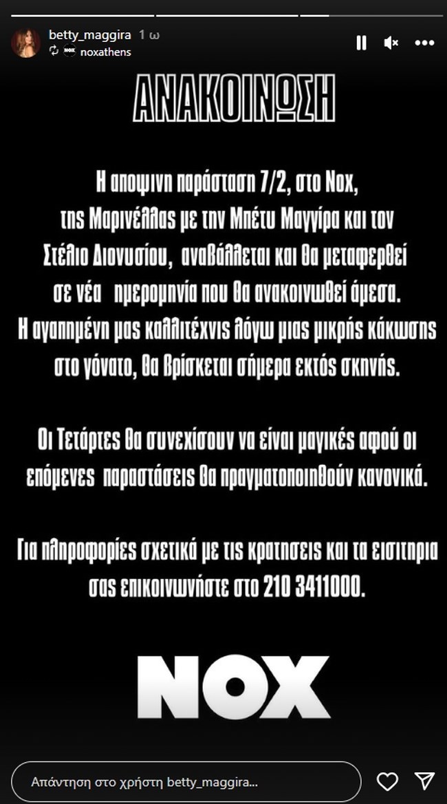 Όπως ανέφερε η επίμαχη ανακοίνωση, η αποψινή παράσταση αναβάλλεται και θα μεταφερθεί σε νέα ημερομηνία, η οποία θα ανακοινωθεί άμεσα. Ο λόγος; Μια μικρή κάκωση που έπαθε στο γόνατο η Μαρινέλλα και η οποία θα την κρατήσει εκτός σκηνής προσωρινά.