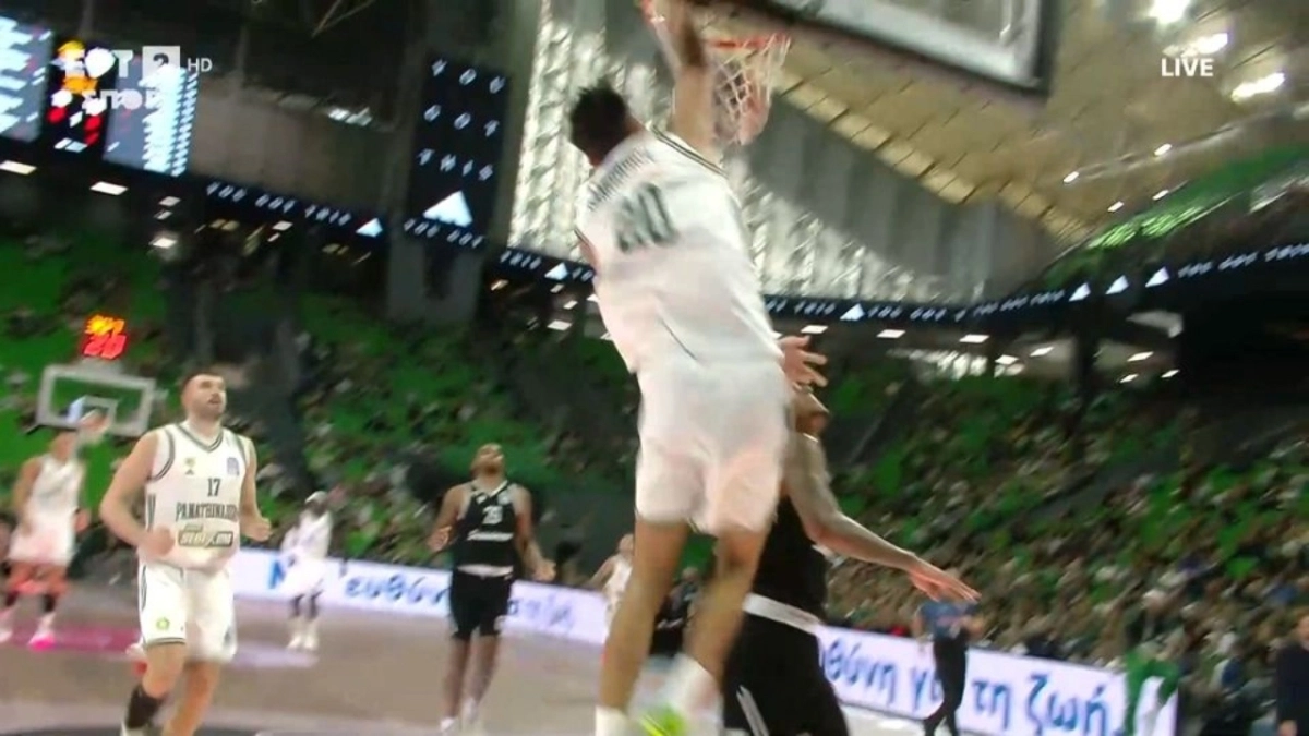 Με δυναμικότητα και ταχύτητα, ο νεαρός Έλληνας εκτέλεσε ένα εντυπωσιακό κάρφωμα, κατορθώνοντας μάλιστα να πάρει και το φάουλ από την αντίπαλη άμυνα του ΠΑΟΚ, πανηγυρίζοντας το «καλάθι και φάουλ» με το κοινό του Παναθηναϊκού.