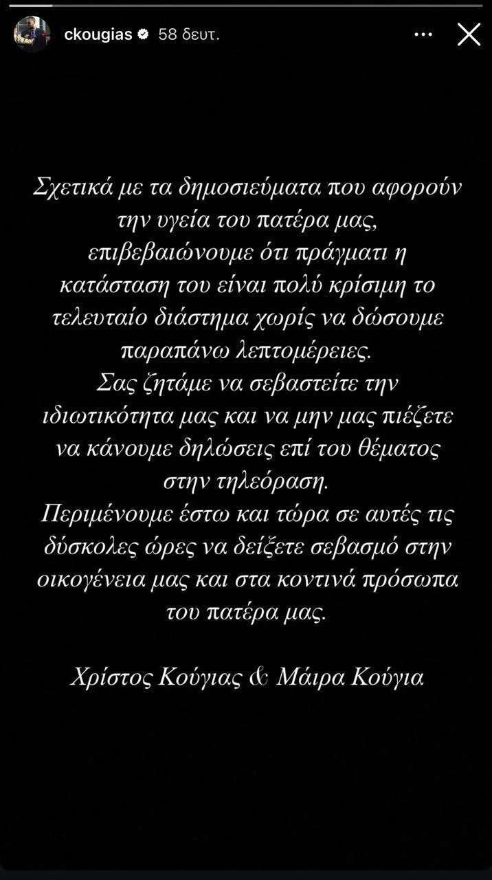Στην ανάρτησή τους, αναφέρουν χαρακτηριστικά: «Σχετικά με δημοσιεύματα που αφορούν την υγεία του πατέρα μας, επιβεβαιώνουμε ότι πράγματι η κατάστασή του είναι πολύ κρίσιμη το τελευταίο διάστημα, χωρίς να δώσουμε παραπάνω λεπτομέρειες».