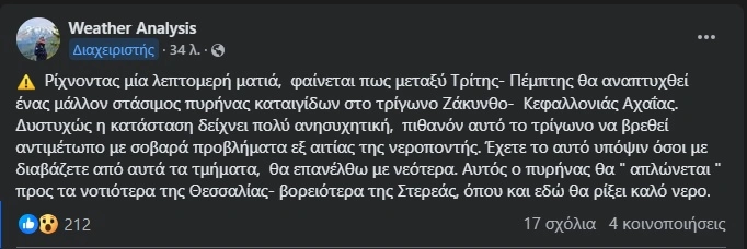 «Ρίχνοντας μία λεπτομερή ματιά, φαίνεται πως μεταξύ Τρίτης- Πέμπτης θα αναπτυχθεί ένας μάλλον στάσιμος πυρήνας καταιγίδων στο τρίγωνο Ζάκυνθο- Κεφαλλονιάς Αχαΐας. Δυστυχώς η κατάσταση δείχνει πολύ ανησυχητική, πιθανόν αυτό το τρίγωνο να βρεθεί αντιμέτωπο με σοβαρά προβλήματα εξ αιτίας της νεροποντής. Έχετε το αυτό υπόψιν όσοι με διαβάζετε από αυτά τα τμήματα, θα επανέλθω με νεότερα. Αυτός ο πυρήνας θα ” απλώνεται ” προς τα νοτιότερα της Θεσσαλίας- βορειότερα της Στερεάς, όπου και εδώ θα ρίξει καλό νερό», αναφέρει στην ανάρτησή της η σελίδα.