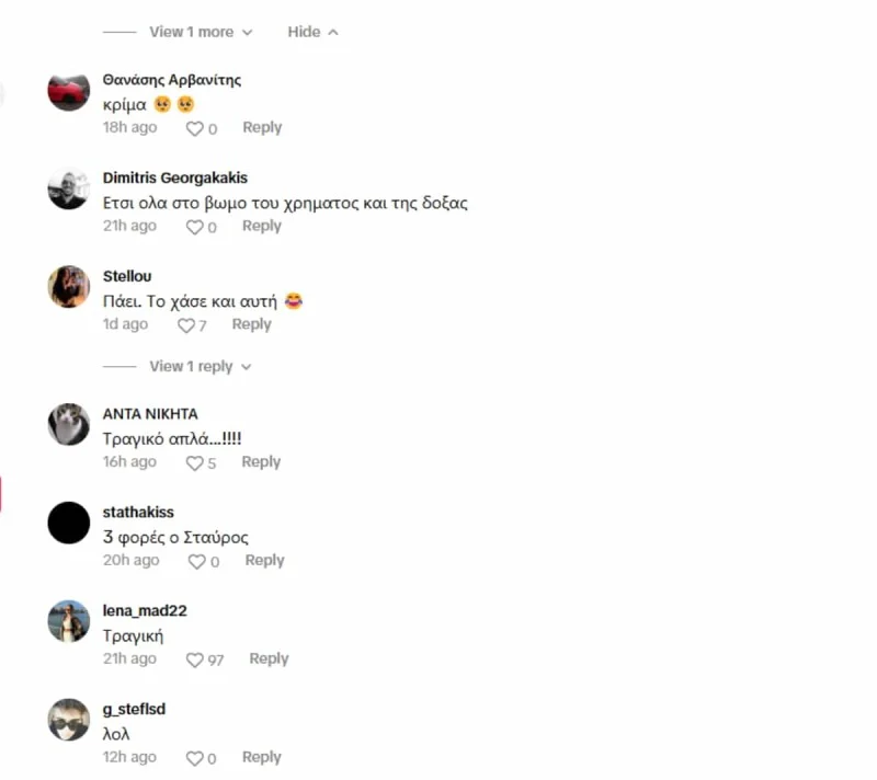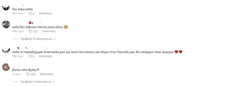Η συγκεκριμένη κίνηση, όμως, δεν έγινε δεκτή με θετικά σχόλια. Πολλοί χρήστες στα social media κατηγόρησαν τη χορεύτρια ότι χρησιμοποίησε τη μνήμη του Παντελίδη για να προσελκύσει likes και προβολές. Κάποιοι υποστήριξαν πως η ενέργεια αυτή ήταν επιτηδευμένη και ασεβής, θεωρώντας ότι παραβίασε τη μνήμη του τραγουδιστή για να τραβήξει την προσοχή.
