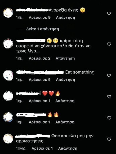 Γενικά, τα περισσότερα σχόλια είχαν απαξιωτικό ύφος, σε σημείο που θα μπορούσε κανείς να μιλήσει για bullying. «Κοίτα να βάλεις κανένα κιλό», «Είναι αποκρουστικό το θέαμα, συγγνώμη κιόλας… Πετσί και κόκαλο και στήθος 12χρονης!», «Κρίμα τόση ομορφιά να χάνεται, καλό θα ήταν να τρως λίγο», «Φάε, κούκλα μου, μην αρρωστήσεις». Αυτά είναι μόνο μερικά από τα δεκάδες σχόλια κάτω από την ανάρτηση της στο Instagram, στα οποία η Μαριέττα Χρουσαλά δεν έχει απαντήσει, ούτε έχει διαγράψει.