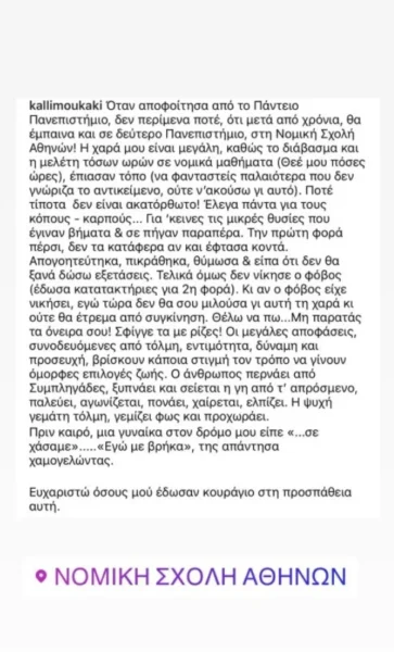 Η Καλλιμούκου μάλιστα έκανε γνωστό μέσα από μια μακροσκελή ανάρτηση στον προσωπικό της λογαριασμό στο Instagram, ότι κατάφερε να περάσει με κατατακτήριες εξετάσεις στην Νομική Σχολή Αθηνών!