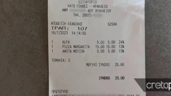Μια οικογένεια, όπως βλέπουμε στη σχετική απόδειξη, πλήρωσε συνολικώς 25 ευρώ για ένα κουτάκι μπύρα, μια ΑΜΙΤΑ και μια κατεψυγμένη πίτσα Μαργαρίτα της πυρκαγιάς.