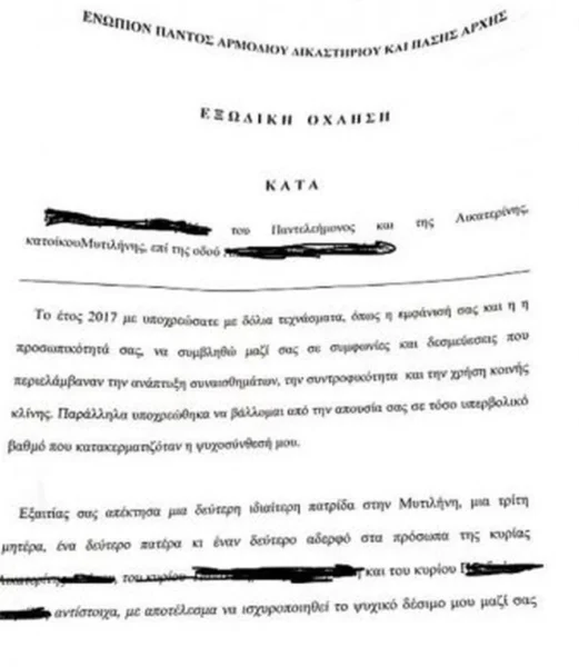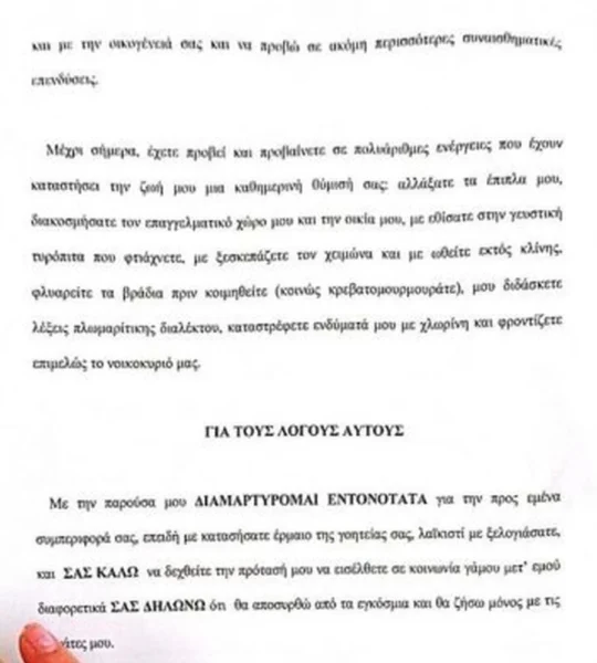 «Με την παρούσα μου διαμαρτύρομαι εντονότατα για την προς εμένα συμπεριφορά σας… Επειδή με καταστήσατε έρμαιο της γοητείας σας. Λαϊκιστί με ξελογιάσατε και σας καλώ να δεχτείτε την πρότασή μου να εισέλθετε σε κοινωνία γάμου μετ’ εμού… Διαφορετικά σας δηλών ότι θα αποσυρθώ από τα εγκόσμια και θα ζήσω μόνος…» αναφέρει το εξώδικο. Ενώ, σύμφωνα με πληροφορίες, η μέλλουσα νύφη, όχι μόνο χαμογέλασε, αλλά φέρεται και να δέχτηκε την πρόταση.