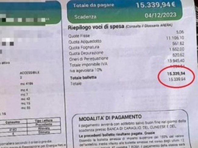 Σύμφωνα με δημοσίευμα της Corriere della Sera η ηλικιωμένη είδε ένα απίστευτο ποσό, ύψους 15.339 ευρώ, ενώ κανονικά έπρεπε να είχε πληρώσει μόλις 55 ευρώ. Το λάθος, το οποίο οφείλεται σε λάθος μέτρηση, όπως όλα δείχνουν, λόγω αυτόματης πληρωμής άδειασε τον τραπεζικό λογαριασμό της 88χρονης… Η οποία έπαθε σοκ από το συμβάν.