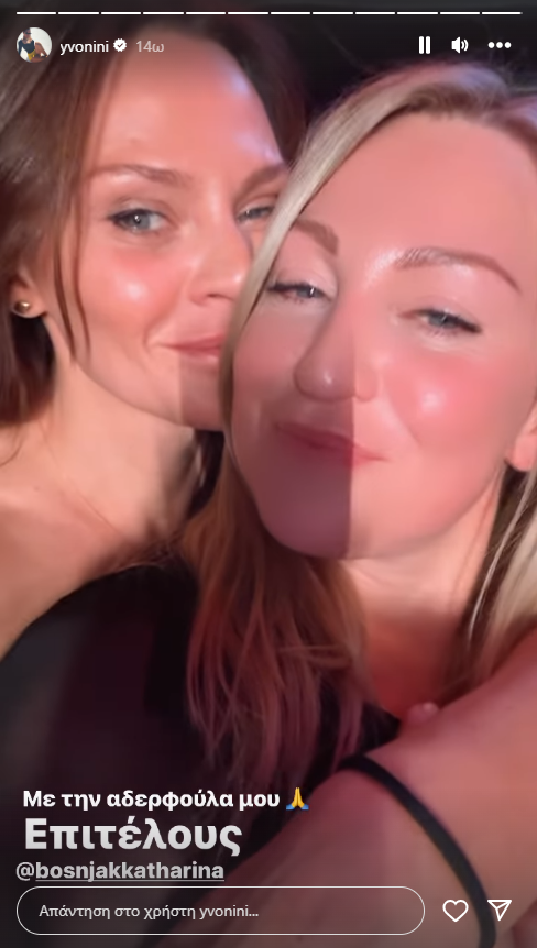 Η Υβόννη, θέλοντας να δείξει τον ενθουσιασμό της που η Katharina ήρθε στην Αθήνα για να την επισκεφτεί… Δημοσίευσε ένα story στο οποίο την φιλά τρυφερά και σχολιάζει «Με την αδερφούλα μου. Επιτέλους»!