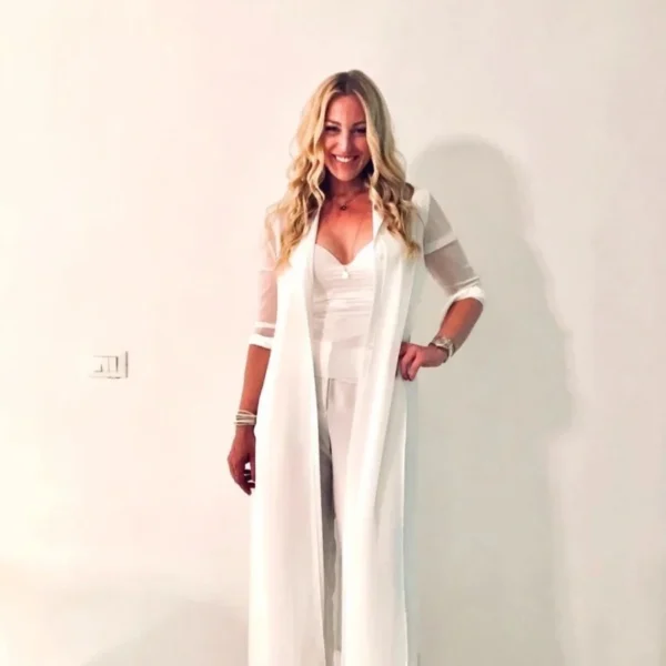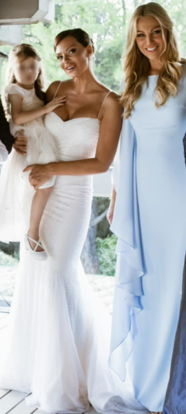 Η Katharina, έδειξε την κομψότατη αισθητική της και στον γάμο της… Υβόννης, στον οποίο επέλεξε να φορέσει ένα maxi φόρεμα σε γαλάζιο χρώμα, το οποίο είχε μακριά μανίκια με σκίσιμο.
