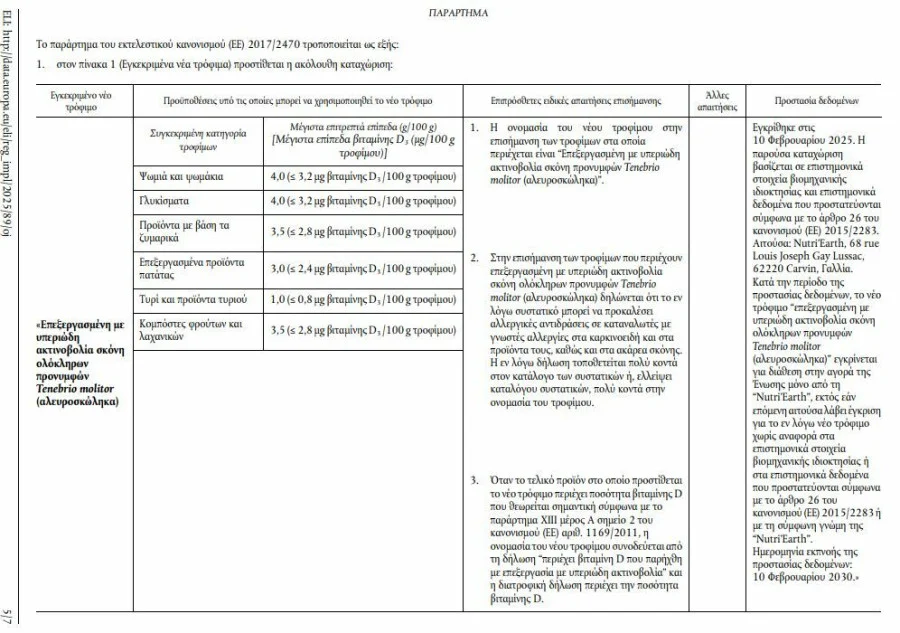 Η Ευρωπαϊκή Επιτροπή, τον περασμένο Ιανουάριο, έδωσε το πράσινο φως για τη χρήση της σκόνης αλευροσκώληκα, που έχει υποστεί επεξεργασία με υπεριώδες φως, ως νέο τρόφιμο. Αυτή η απόφαση αποτελεί μέρος μιας ευρύτερης στρατηγικής της ΕΕ για τη μείωση των περιβαλλοντικών επιπτώσεων του διατροφικού συστήματος και την προώθηση της βιώσιμης γεωργίας.