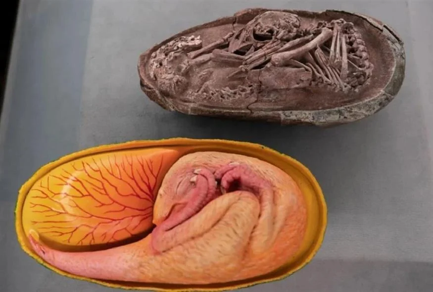 Στη σχετική μελέτη, που δημοσιεύτηκε στο iScience, οι επιστήμονες εξηγούν ότι, η στάση του εμβρύου ήταν, με το κεφάλι «στην κοιλιακή χώρα, με τα πόδια ανοιχτά σε κάθε πλευρά και την πλάτη κουλουριασμένη κατά μήκος του αμβλέος πόλου του αυγού».