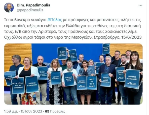 Σε πρωτοφανή προσπάθεια εκμετάλλευσης της τραγωδίας με το ναύαγιο στην Πύλο επιδόθηκε ο αντιπρόεδρος του ευρωπαϊκού κοινοβουλίου Δημήτρης Παπαδημούλης, συνεπικουρούμενος από ευρωβουλευτές της Αριστερά, των Πρασίνων και των Σοσιαλιστών, ανάμεσα στους οποίους οι Κώστας Αρβανίτης και Έλενα Κουντουρά, φωτογραφήθηκε κρατώντας αφίσες με το μήνυμα «όχι άλλοι θάνατοι. Οι ζωές των προσφύγων έχουν αξία».