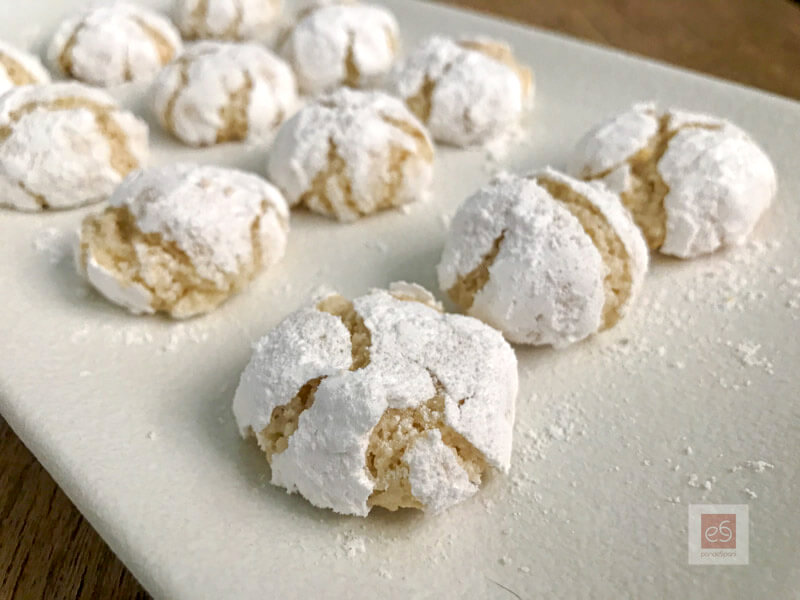 Πλάθουμε το μίγμα σε μικρές μπαλίτσες και τις περνάμε πρώτα από την κρυσταλλική ζάχαρη και στη συνέχεια από τη ζάχαρη άχνη.