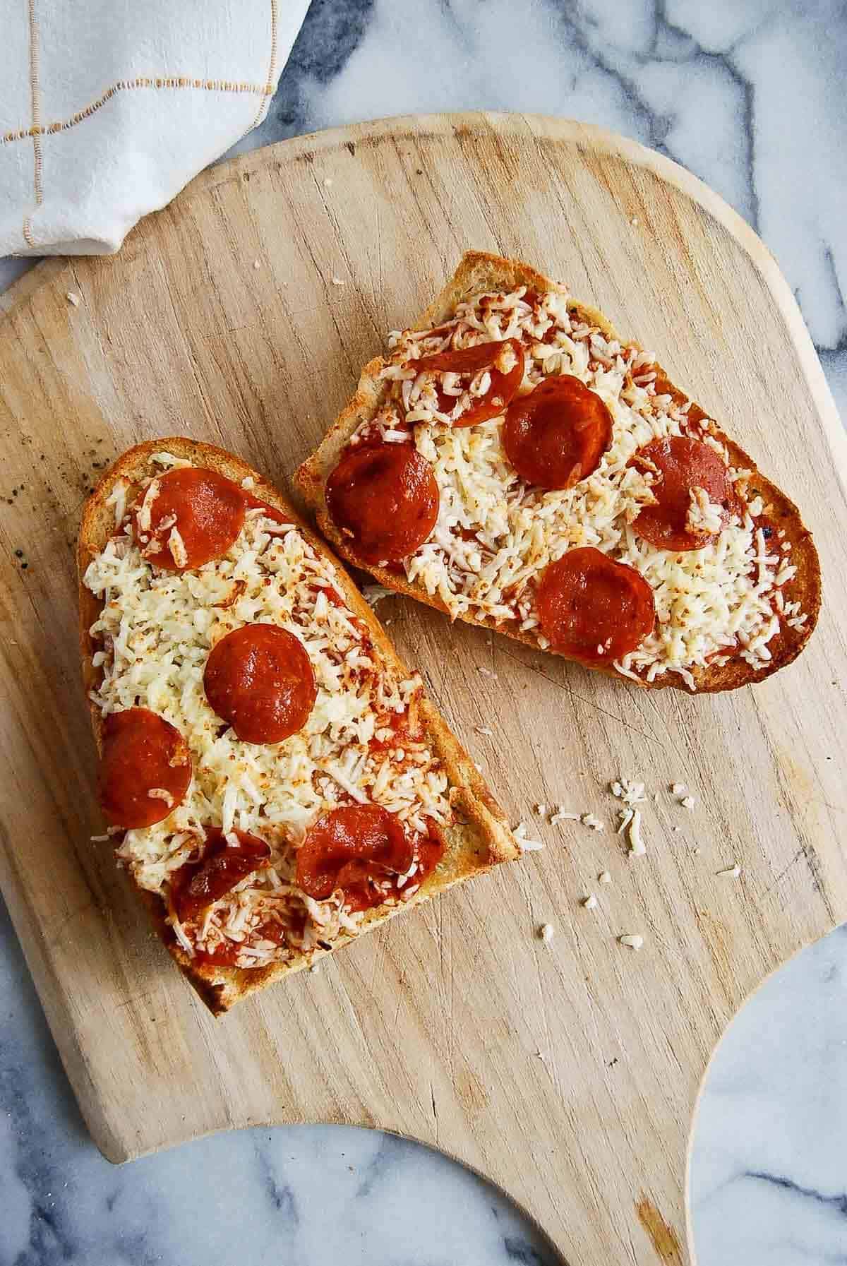 Απλώστε τη μαρινάρα πάνω στο ψωμί και προσθέστε τη μοτσαρέλα, τις φέτες πεπερόνι, την παρμεζάνα και λίγες νιφάδες κόκκινης πιπεριάς. Ξαναβάλτε το στο φούρνο και ψήστε για άλλα 10 λεπτά, μέχρι να λιώσει το τυρί.