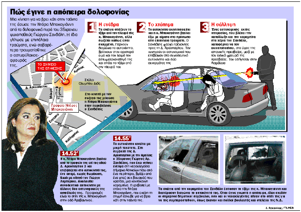 «Εξαιρετικά δύσκολη στιγμή όταν έγινε η απόπειρα δολοφονίας. Περνάει η σφαίρα μέσα από το αυτοκίνητο, έχω σκύψει για να πάρω την τσάντα μου, βλέπω τη σφαίρα, περνάει τον λαιμό του Γιώργου και πάει απέναντι στις στήλες του Ολυμπίου Διός. Για ένα μεγάλο διάστημα δεν καταλάβαινα τι έγινε, στην αρχή νόμιζα ότι ανατινάχθηκε το κινητό» δήλωσε η Ντόρα Μπακογιάννη.