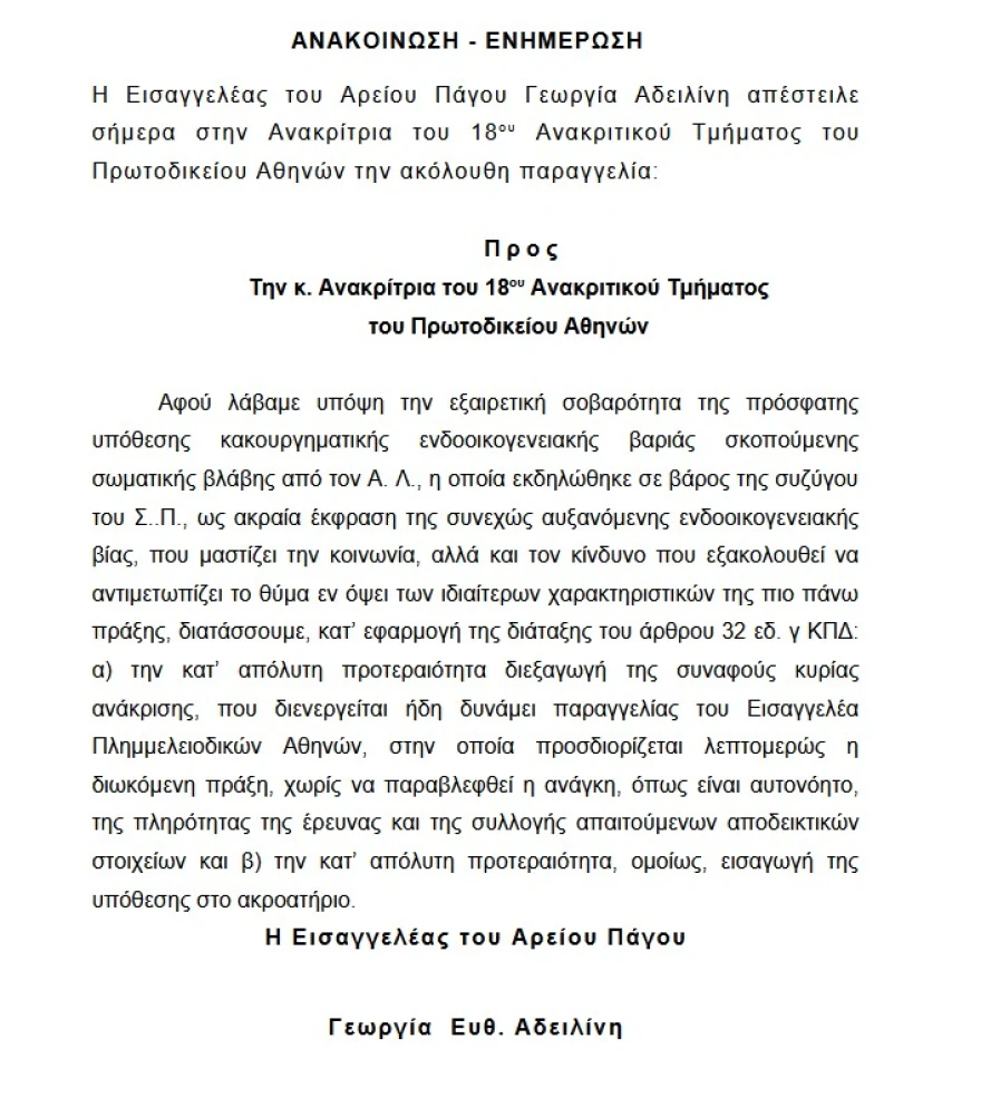 Με την ίδια εντολή, η εισαγγελέας του Αρείου Πάγου ζητά επίσης η υπόθεση να προωθηθεί στο ακροατήριο κατά προτεραιότητα.