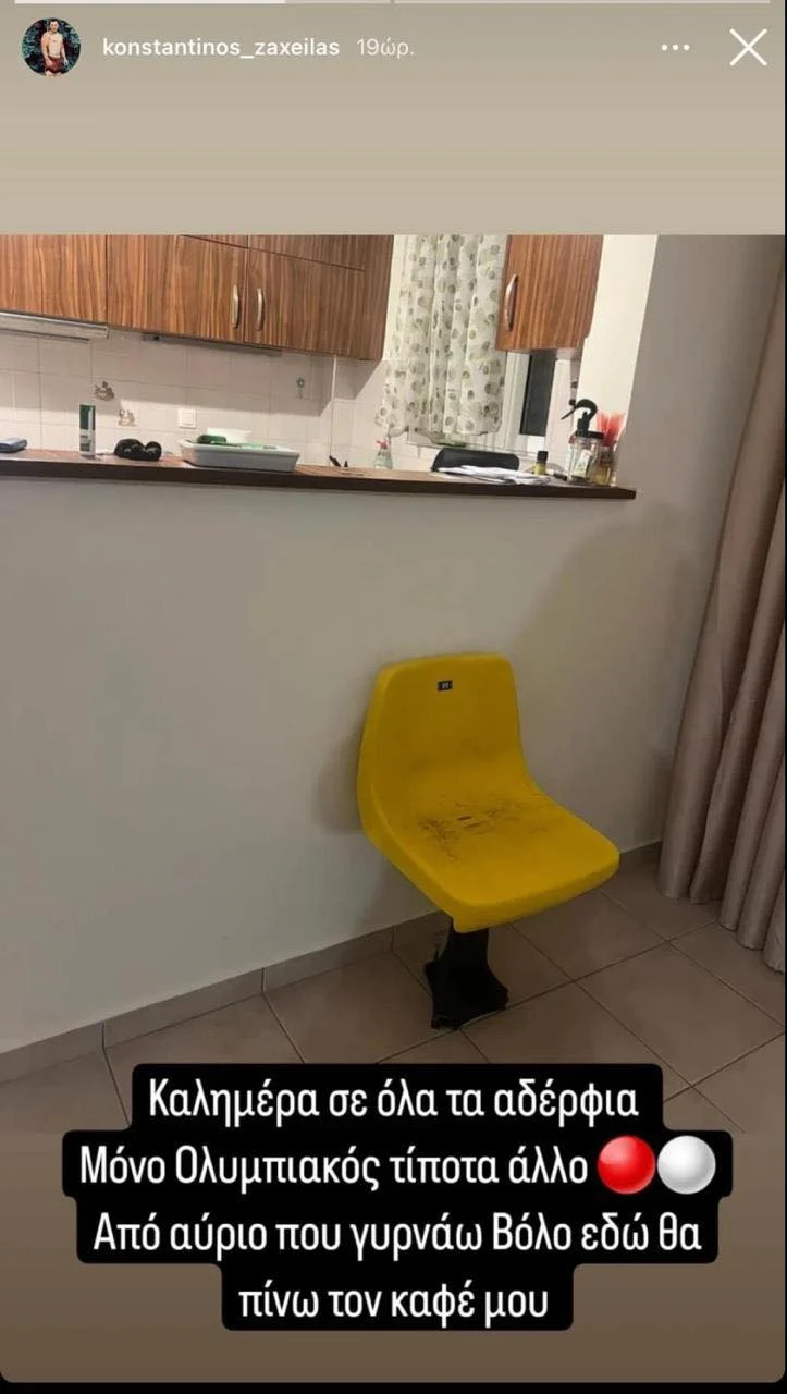 «Καλημέρα σε όλα τα αδέλφια. Μόνο Ολυμπιακός, τίποτα άλλο. Από αύριο που γυρνάω Βόλο, εδώ θα πίνω τον καφέ μου».