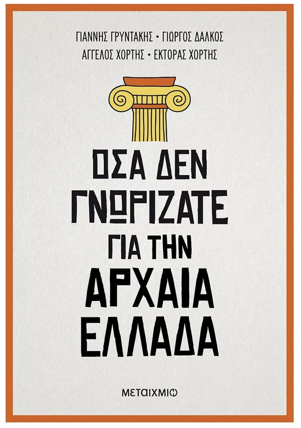 Αυτές είναι μερικές μόνο από τις ερωτήσεις που απαντώνται στο νέο πολυσέλιδο βιβλίο Όσα δεν γνωρίζατε για την αρχαία Ελλάδα, που κυκλοφορεί από τις εκδόσεις Μεταίχμιο. Συγγραφείς είναι τέσσερις καταξιωμένοι καθηγητές και κάτοχοι τίτλων ιστορίας: οι διδάκτορες Ιστορίας του Πανεπιστημίου Αθηνών, Γιάννης Γρυντάκης και Άγγελος Χόρτης, ο κάτοχος διδακτορικού του τομέα παιδαγωγικής της Φιλοσοφικής Σχολής Αθηνών, Γιώργος Δάλκος, και ο πτυχιούχος Ιστορίας – Αρχαιολογίας του Πανεπιστημίου Αθηνών, Έκτορας Χόρτης.