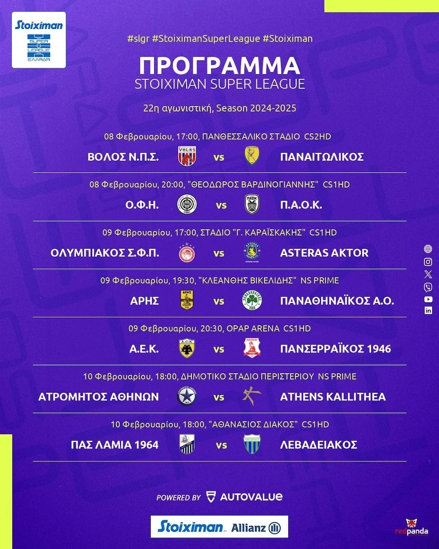 Ανάμεσα στις αναμετρήσεις της 22ης αγωνιστικής της Super League, το παιχνίδι του Άρη με τον Παναθηναϊκό συγκεντρώνει το μεγαλύτερο ενδιαφέρον. Η αγωνιστική δράση κορυφώνεται την Κυριακή (9/2) και θα ολοκληρωθεί τη Δευτέρα (10/2).