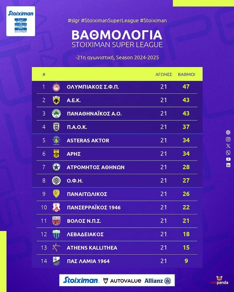 Μετά από 21 αγωνιστικές, ο Ολυμπιακός διατηρεί την πρωτοκαθεδρία στη βαθμολογία με 47 βαθμούς. Ενώ η ΑΕΚ και ο Παναθηναϊκός ακολουθούν ισοβαθμίες με 43. Ο ΠΑΟΚ βρίσκεται στην τέταρτη θέση με 37 βαθμούς. Ενώ η πεντάδα συμπληρώνει ο Αστέρας Τρίπολης με 34.