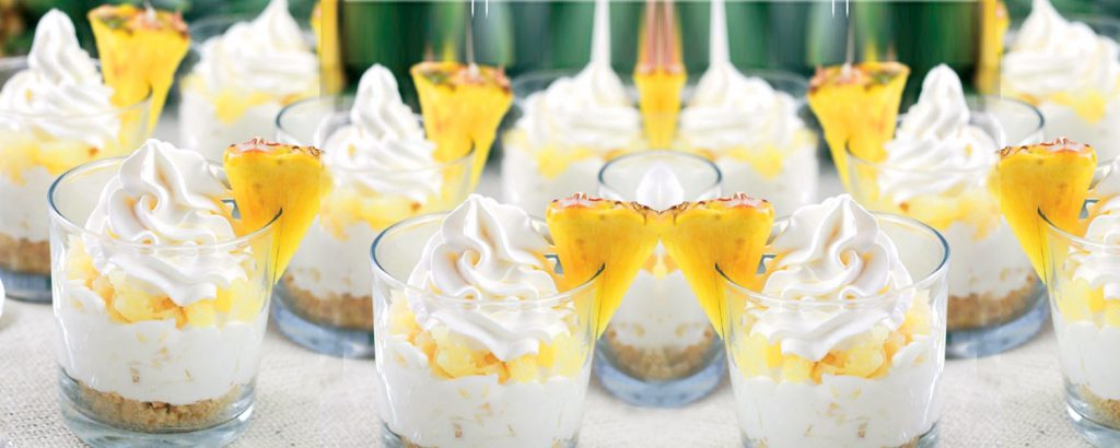 Βάλτε το μίγμα που κρατήσατε στην άκρη σε κορνέ ζαχαροπλαστικής και δημιουργήστε ροζέτες πάνω από τα κομματάκια του ανανά (ή απλά μοιράστε το με ένα κουτάλι). Καλύψτε τις κούπες με πλαστική μεμβράνη και βάλτε τις στο ψυγείο μέχρι να σερβίρετε.