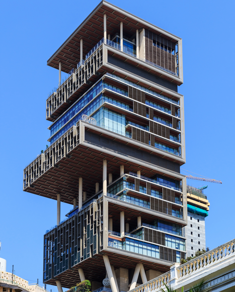 Η Antilia, η έπαυλη – ουρανοξύστης, που ανήκει στον πλουσιότερο άνθρωπο της Ινδίας, τον Mukesh Ambani, βρίσκεται σε μία από τις ακριβότερες διευθύνσεις του κόσμου, την Altamount Road, ή τον δρόμο των δισεκατομμυριούχων, στη Βομβάη.