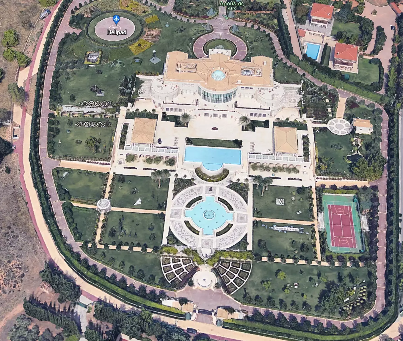 Η πρώτη επαφή με την έκταση των 50 στρεμμάτων στην Κηφισιά, όπου δεσπόζει η έπαυλη, προκαλεί δέος. Ακόμη και οι τεχνολογικά καταρτισμένοι μηχανικοί της Google, σύμφωνα με πληροφορίες, έμειναν έκθαμβοι όταν αντίκρισαν την έκταση από ψηλά μέσω του Google Earth. Η επιβλητική κατασκευή, με την αρχιτεκτονική της που θυμίζει σκηνικά από την αμερικανική τηλεοπτική σειρά “Δυναστεία”, μαρτυρά μια ζωή γεμάτη επιτυχίες και ανέσεις.