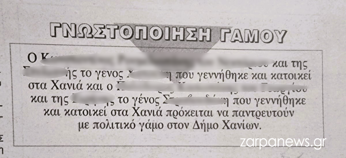Η αγγελία δημοσιεύθηκε στην εφημερίδα “Χανιώτικα Νέα”, στο φύλλο που κυκλοφόρησε το Σάββατο… Και αφορά στον γάμο δύο ανδρών που κατοικούν στα Χανιά και θα τελεστεί στον Δήμο της περιοχής.