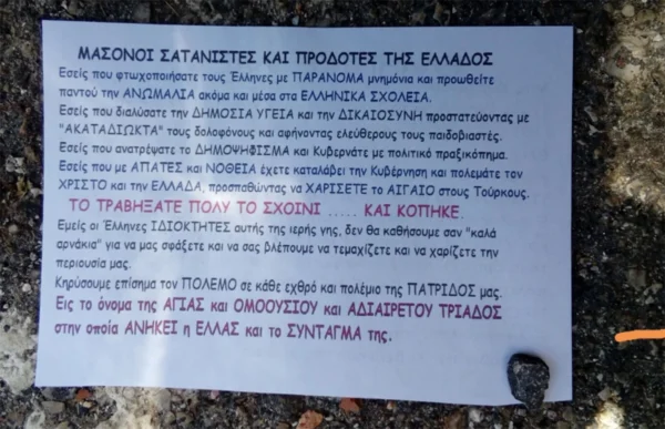 Μάλιστα, δημοσίευσε και φωτογραφίες από φέιγ βολάν που έγραφαν «Μασόνοι Σατανιστές και Προδότες της Ελλάδος» και «κηρύσσουμε επίσημα τον πόλεμο σε κάθε εχθρό και πολέμιο της πατρίδος μας».