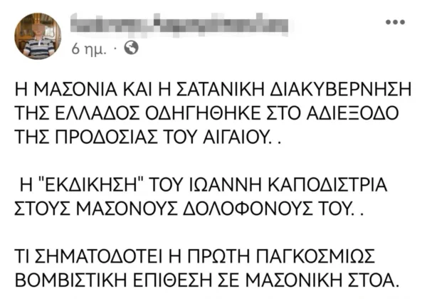 Σύμφωνα με πληροφορίες, ο 61χρονος βομβιστής, δηλώνει «Θεματοφύλακας του Συντάγματος», όπως προκύπτει από τις αναρτήσεις του, ενώ στρέφεται με μίσος κατά της Μασονίας και των σατανικών κυβερνήσεων. Μάλιστα κάνει λόγο για «εκδίκηση» του Ιωάννη Καποδίστρια στους «μασόνους δολοφόνους»