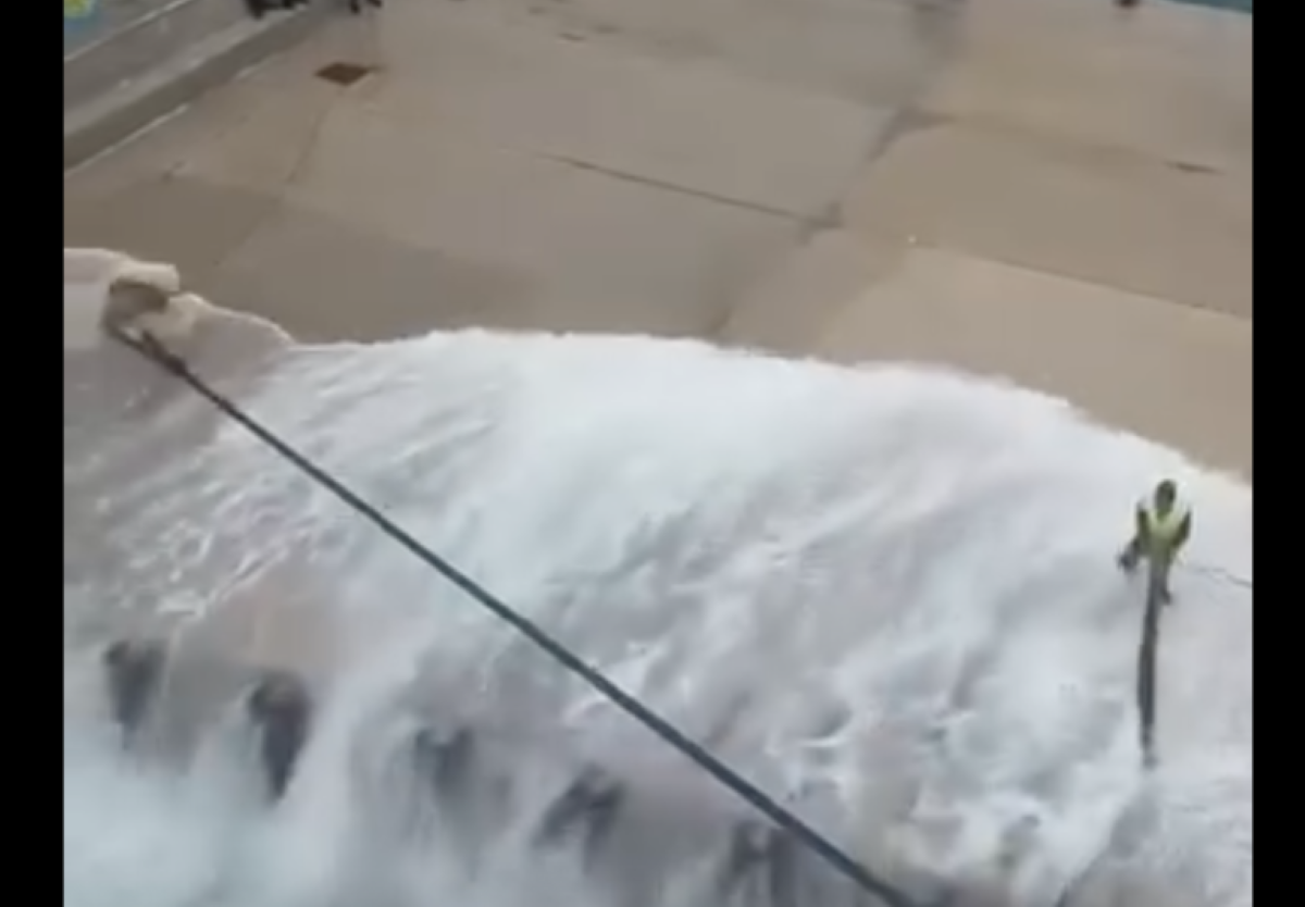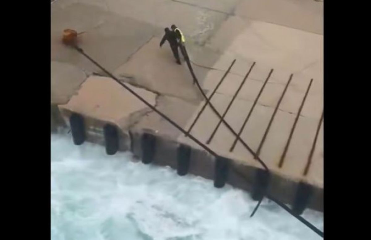 Η προσπάθεια πρόσδεσης: Στο βίντεο διακρίνονται οι λιμενεργάτες να δίνουν τη δική τους μάχη πάνω στον βρεγμένο προβλήτα, προσπαθώντας να πιάσουν τους κάβους, την ώρα που το πλοίο κλυδωνιζόταν επικίνδυνα.