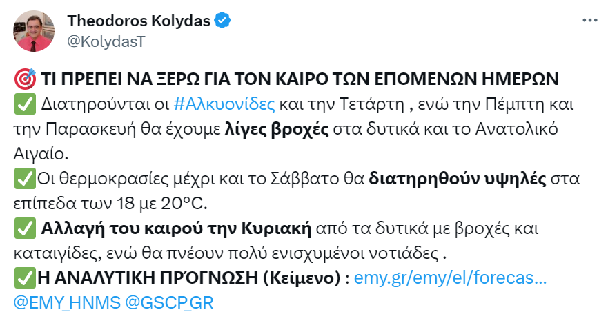 Σύμφωνα την ανάρτησή του, ο διευθυντής της Εθνικής Μετεωρολογικής Υπηρεσίας (ΕΜΥ), Θοδωρής Κολυδάς τονίζει πως ο καιρός αλλάζει την Κυριακή.