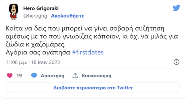Οποιος γελαει με αυτο, ειναι ομοφοβικος και φασιστας.#firstdates pic.twitter.com/v6G3Eu4aKm— Evgenios🇬🇷Tzavaras (@EvgeniosTzav) June 19, 2023